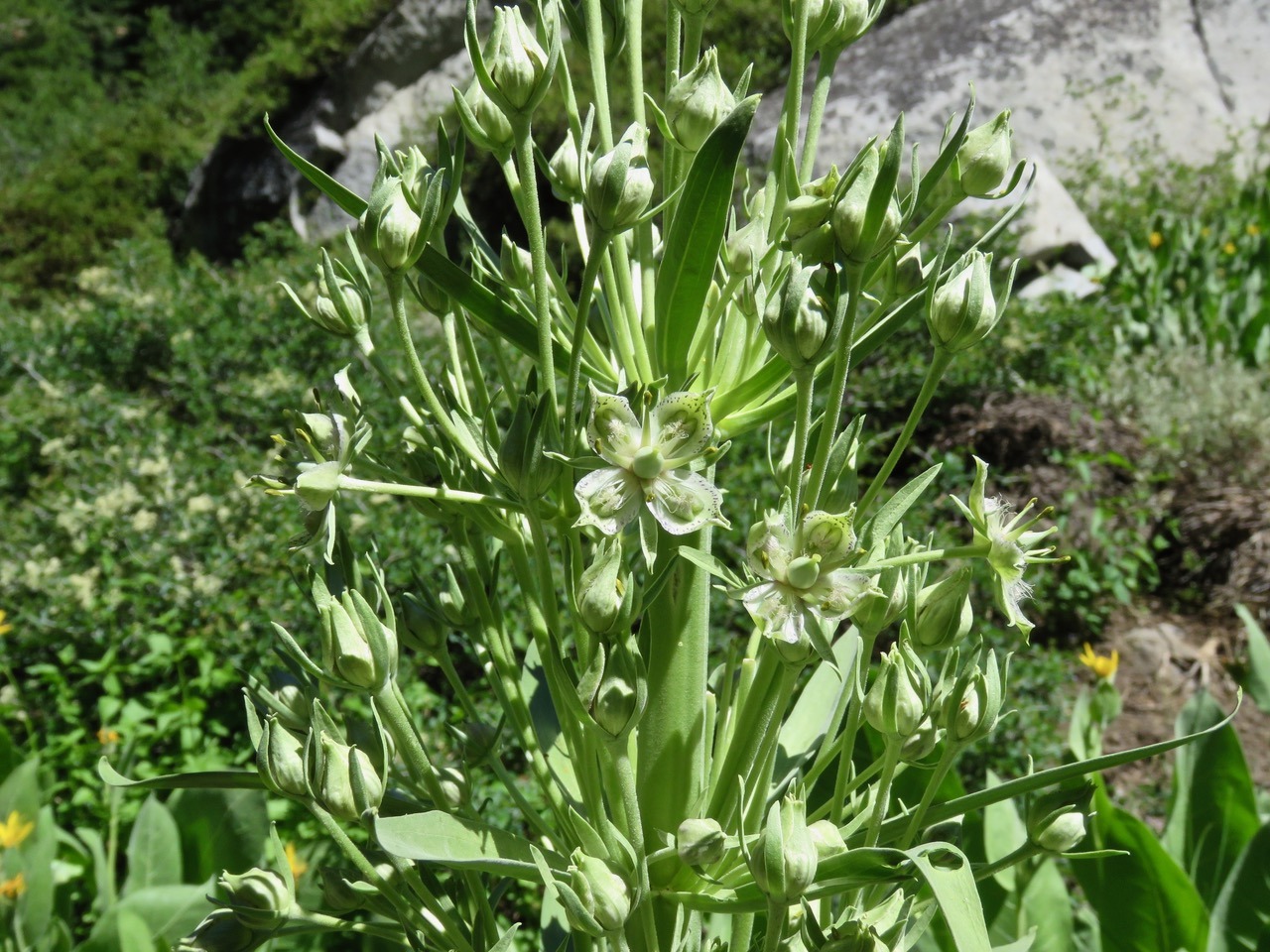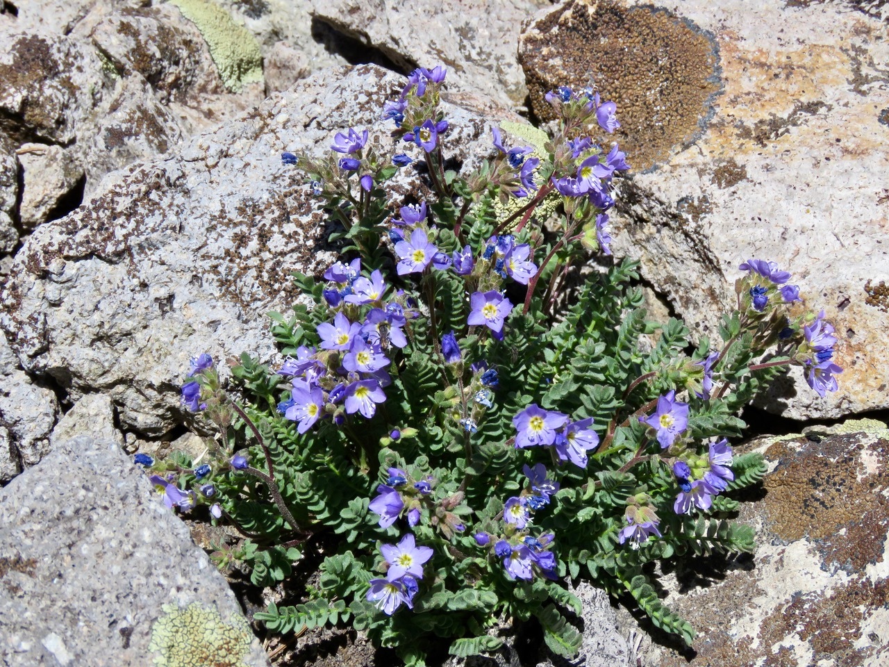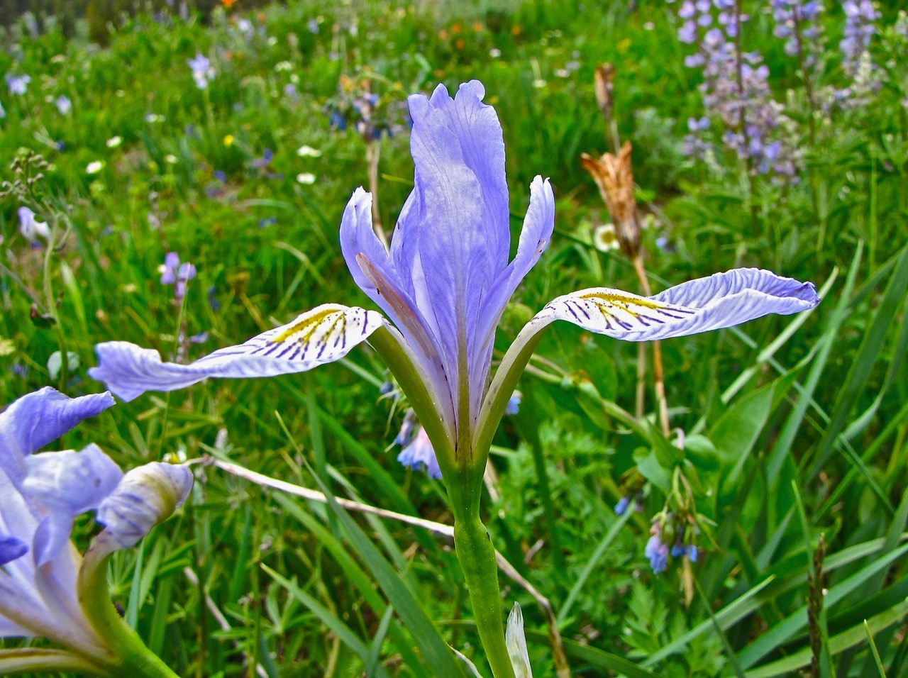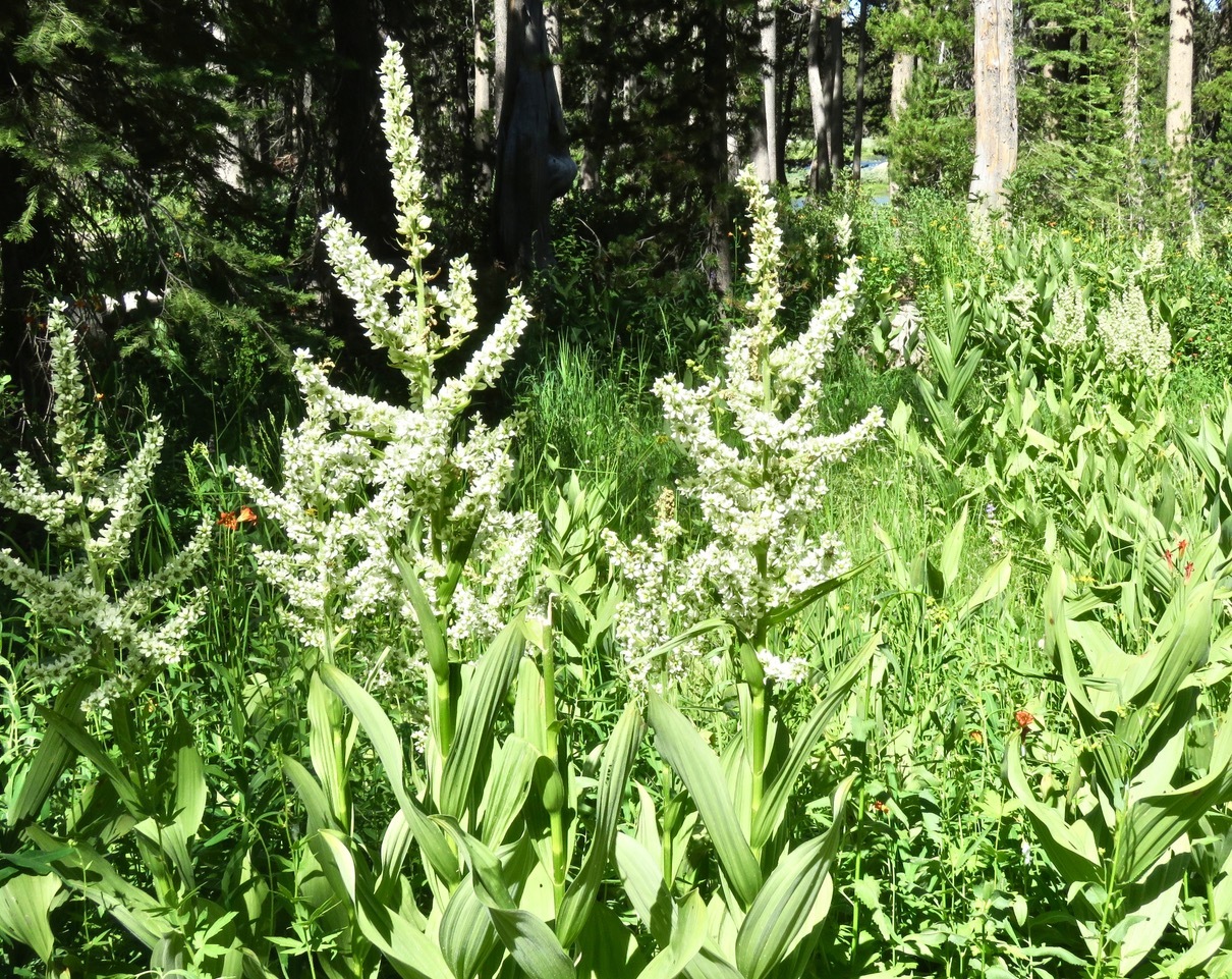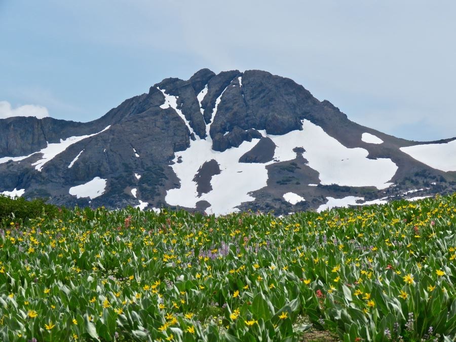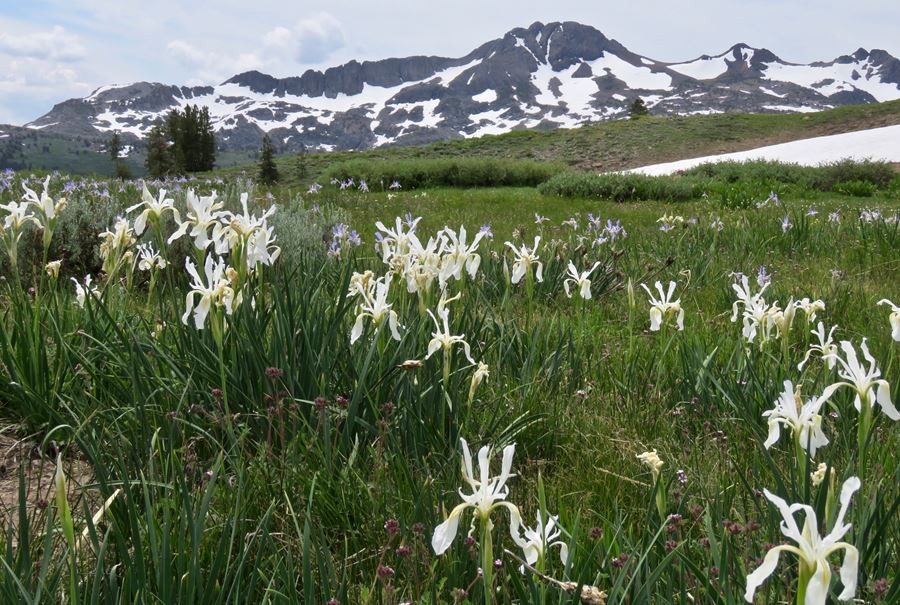 The flowers along the small creek that flows down the side of Meiss Ridge though the Schneider Camp area and into the meadow beyond in the Schneider Camp area bloom and wilt earlier than those that grow to the south of Carson Pass. This is because the area that the flowers grow in is lower than the Carson Pass area and it faces west. It is also well watered by the creek that flows down the side of Meiss Ridge.