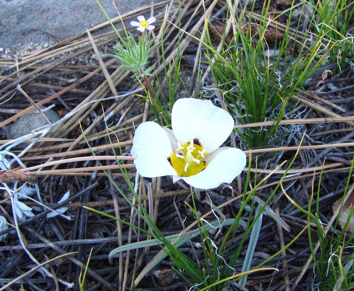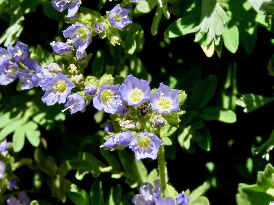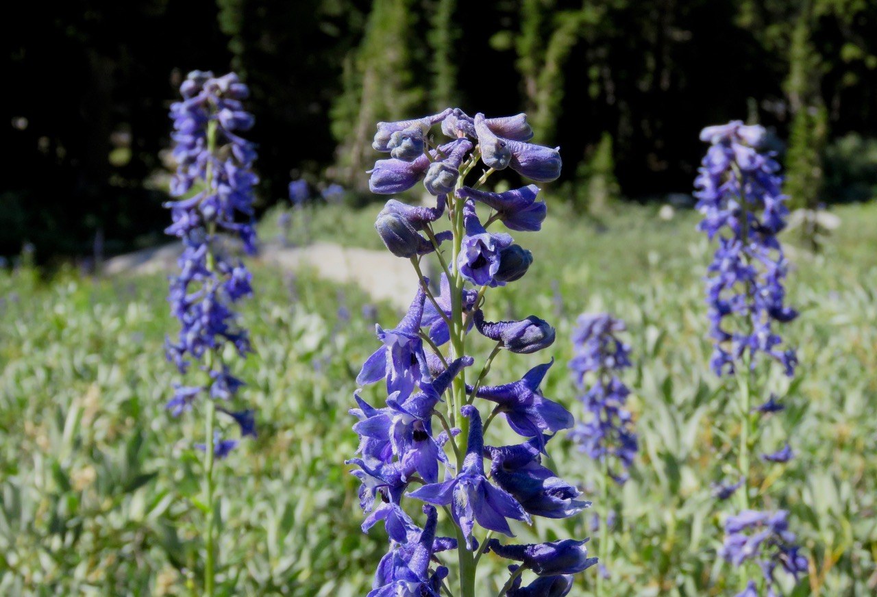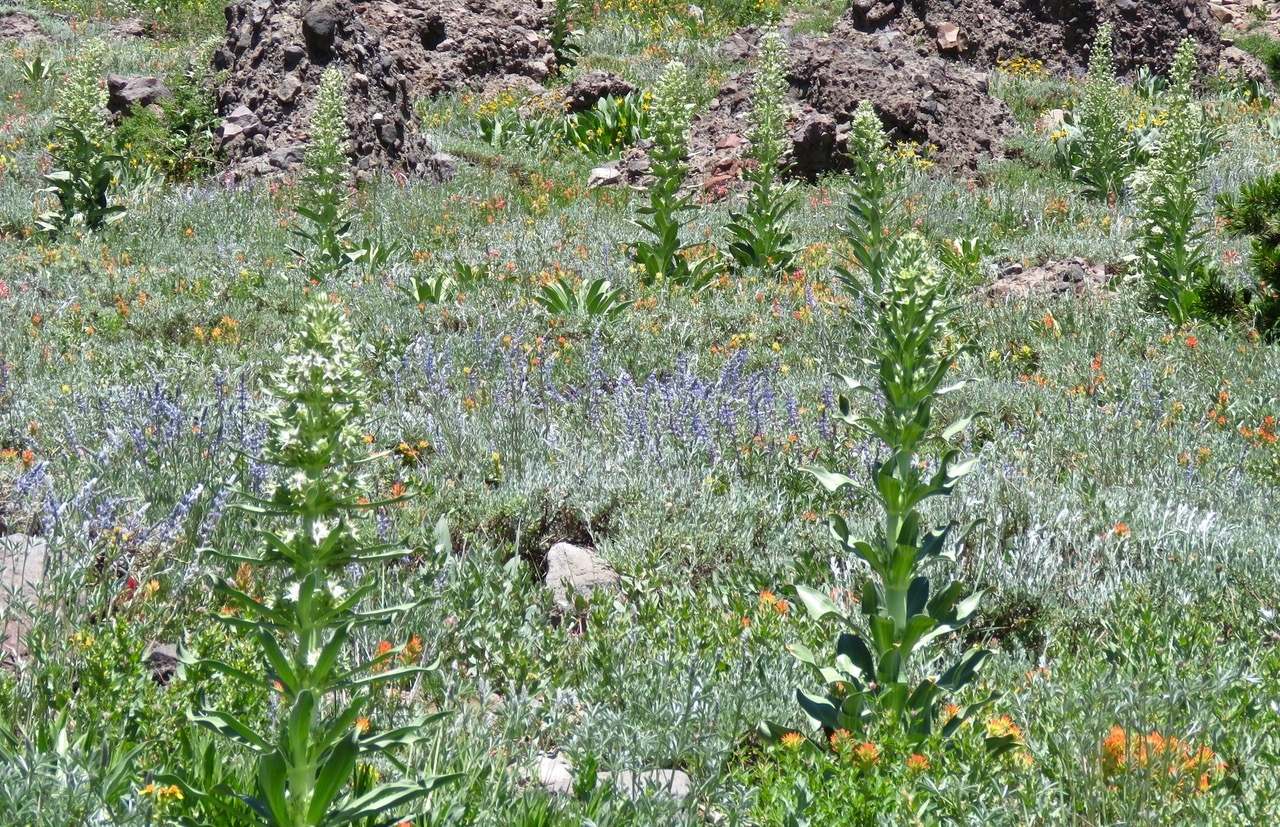 The flowers along the small creek that flows down the side of Meiss Ridge though the Schneider Camp area and into the meadow beyond in the Schneider Camp area bloom and wilt earlier than those that grow to the south of Carson Pass. This is because the area that the flowers grow in is lower than the Carson Pass area and it faces west. It is also well watered by the creek that flows down the side of Meiss Ridge.